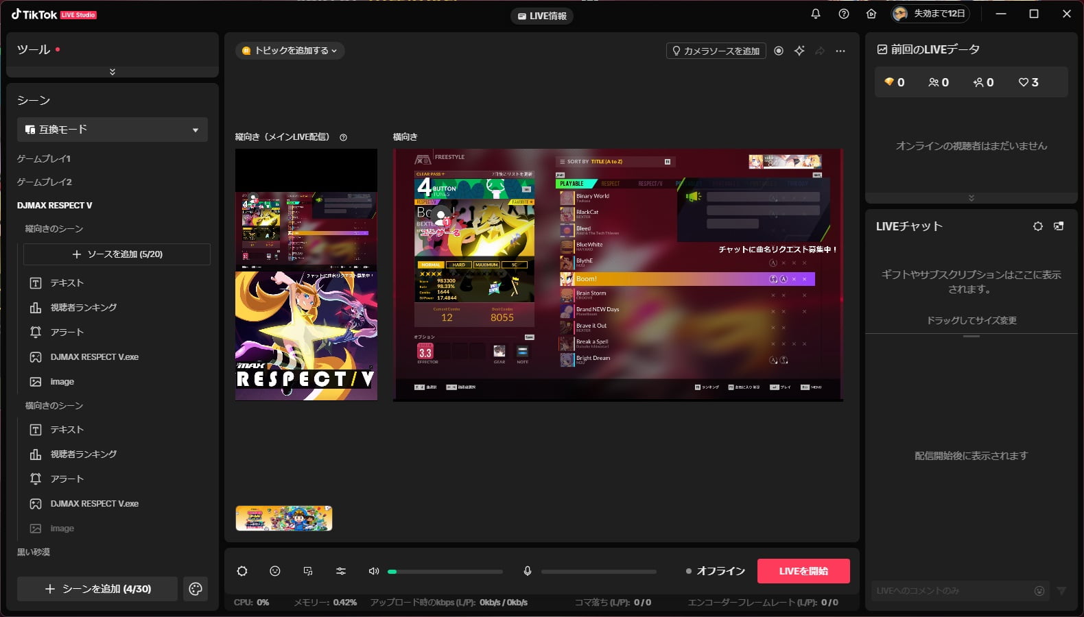 んで、LIVE Studioが使えるから前からやりたかった、TikTokでのPCゲームのライブ配信をしたわけですよ。
