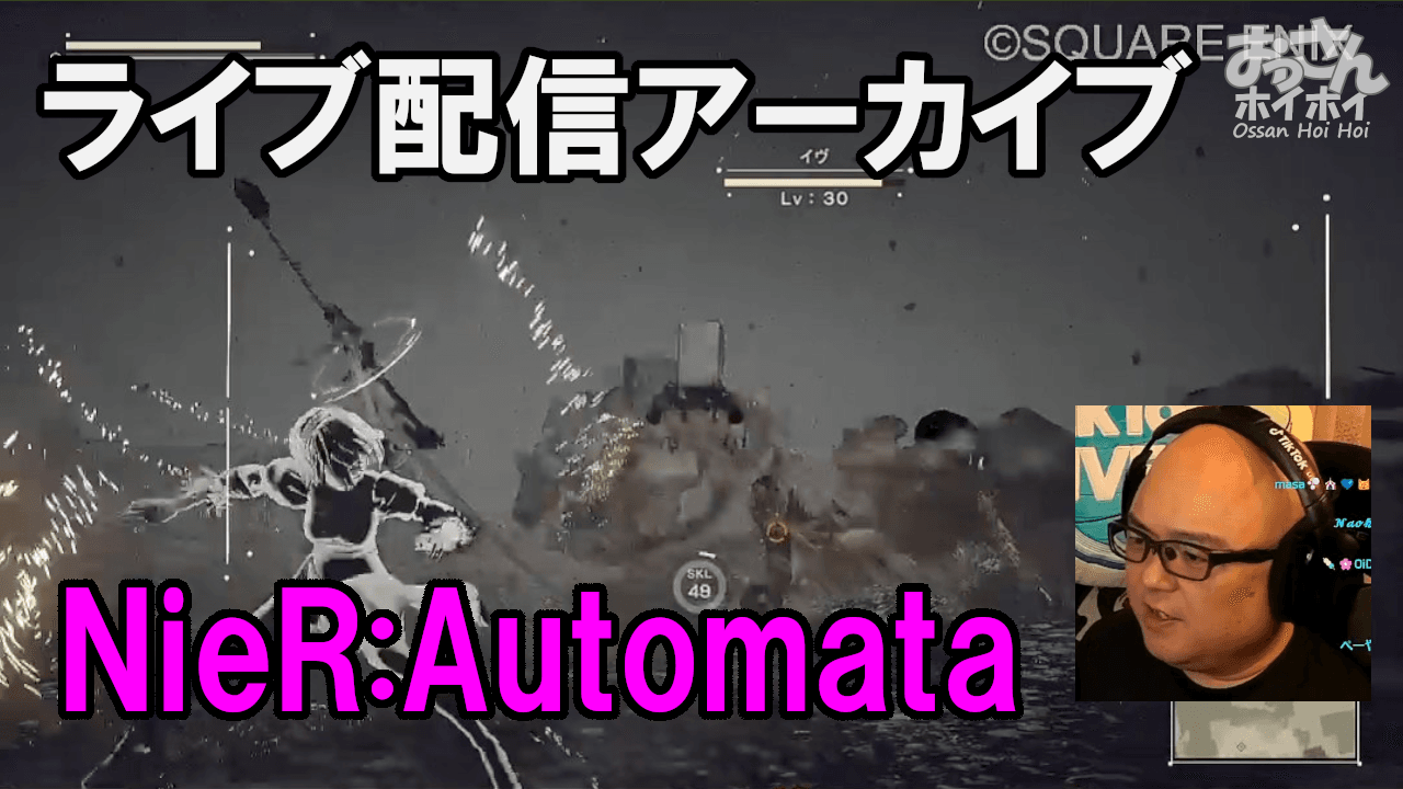 そして今回一番の衝撃だったのが、ゲーム冒頭の設定画面の演出だった。「設定画面のあの演出、俺がやった操作を9Sが裏でやってたってことか!これ、鳥肌もんの仕掛けだよな。」[02:00:54] 明るさや音量の調整が、実は9Sが2Bのメンテナンスを行っていたという演出だったことが2周目で明かされる。1周目のあの操作に意味が付与される瞬間で、ゲームデザインとして本当によくできていると思った。