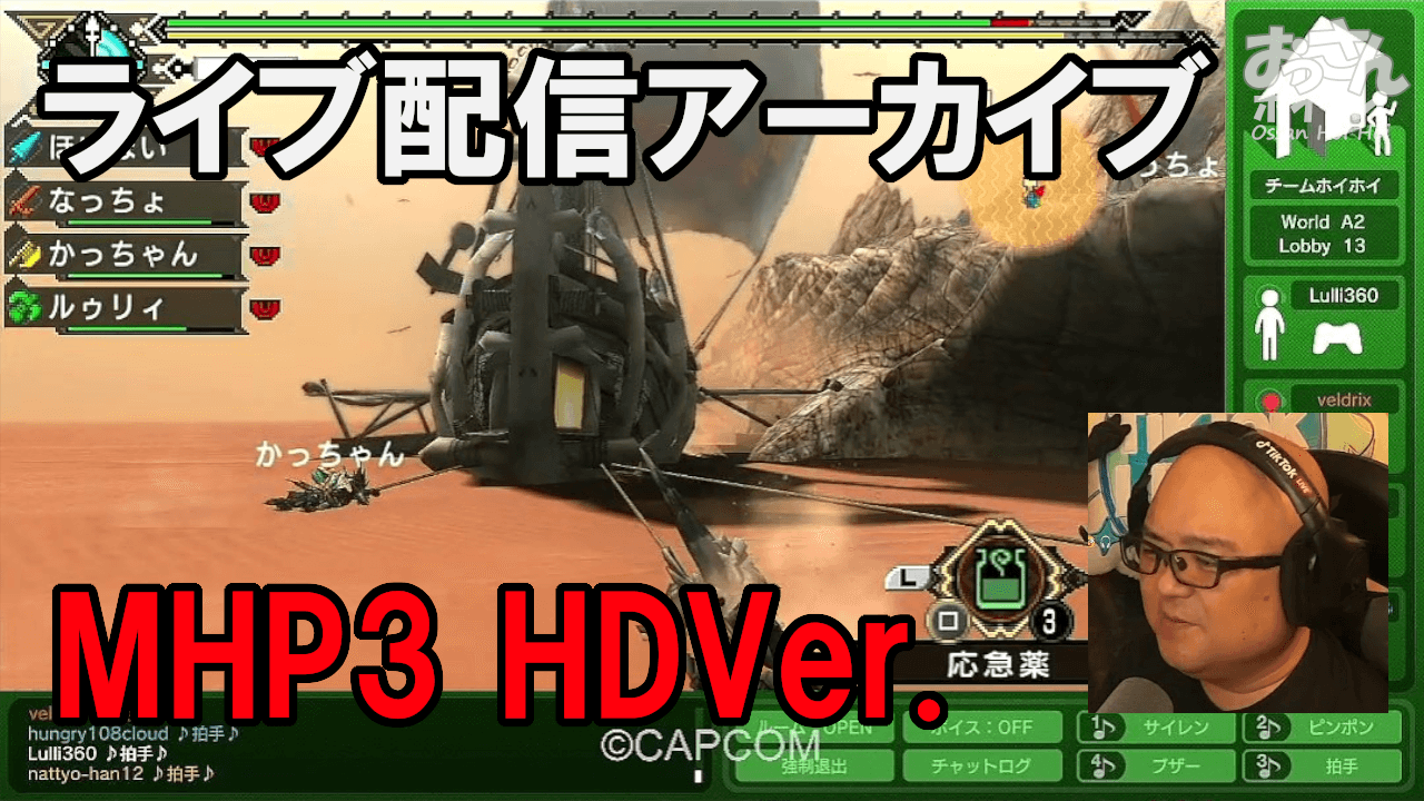 2011年にPS3向けに発売されたMHP3のHDリマスター版。PSPの大ヒット作が高解像度で蘇った一本で、マルチプレイの快適さとユクモ村の雰囲気が今でも魅力的だ。今夜はリスナーのランク上げをメインに据えた配信で、自分のキャラの強化よりも仲間のサポートに徹した形になった。